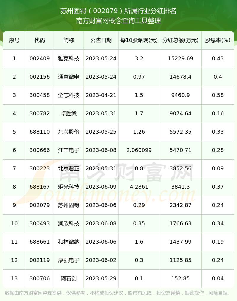 按照南方財(cái)富網(wǎng)趨勢(shì)選股系統(tǒng)統(tǒng)計(jì),蘇州固锝所屬行業(yè)為新能源材料行業(yè),新能源材料行業(yè)分紅排名情況如下表:
