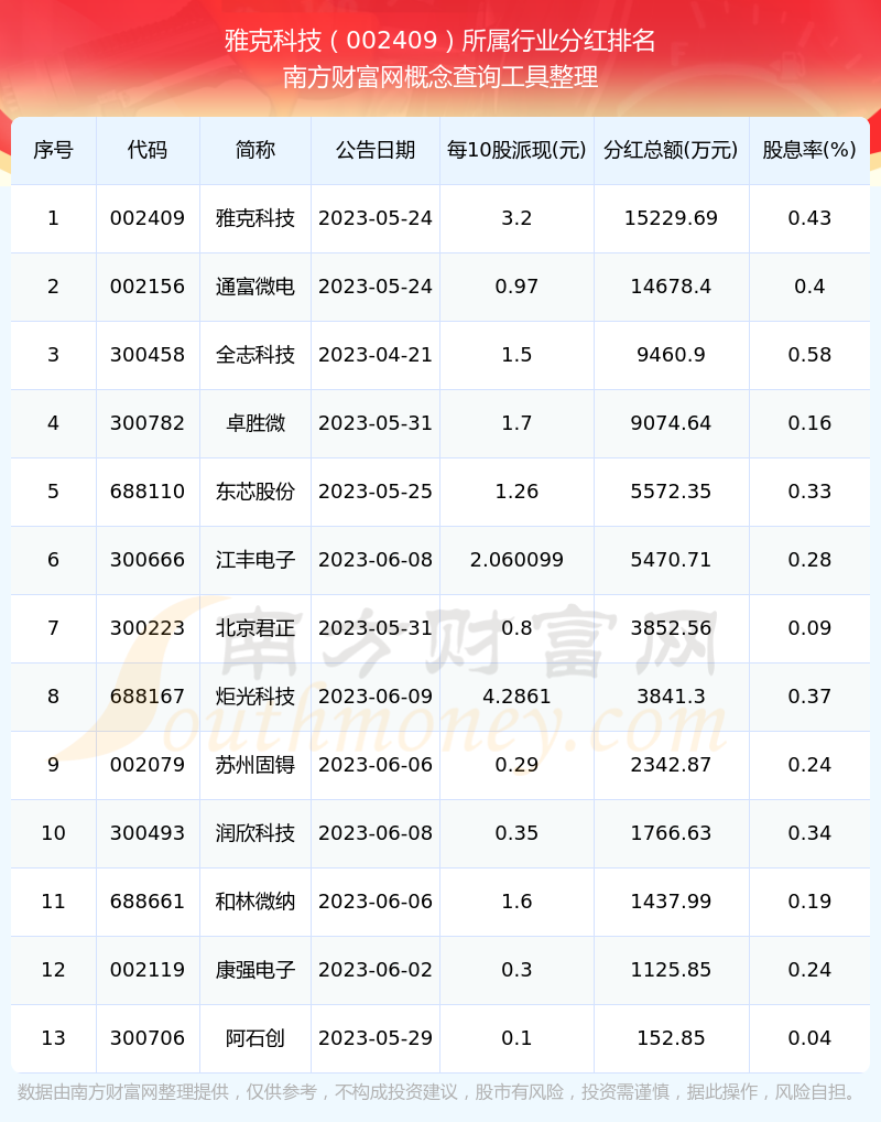 按照南方財富網(wǎng)趨勢選股系統(tǒng)統(tǒng)計,雅克科技所屬行業(yè)為光刻膠行業(yè),光刻膠行業(yè)分紅排名情況如下表: