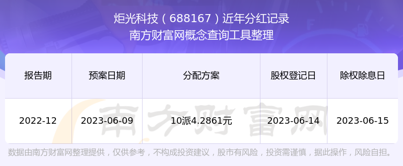 炬光科技最新一次公布的分紅方案為10派4.2861元。本次權(quán)益分派股權(quán)登記日為2023年6月14日,除權(quán)除息日為2023年6月15日,派息日為2023年6月15日。