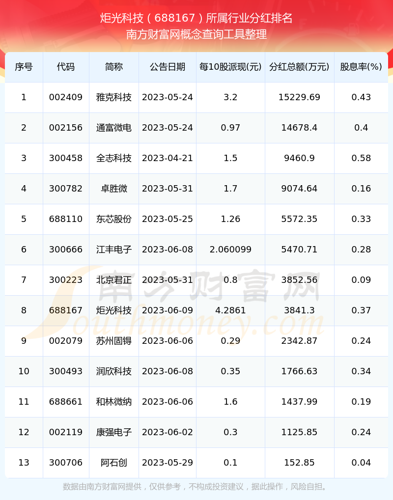 按照南方財(cái)富網(wǎng)趨勢(shì)選股系統(tǒng)統(tǒng)計(jì),炬光科技所屬行業(yè)為激光行業(yè),激光行業(yè)分紅排名情況如下表: