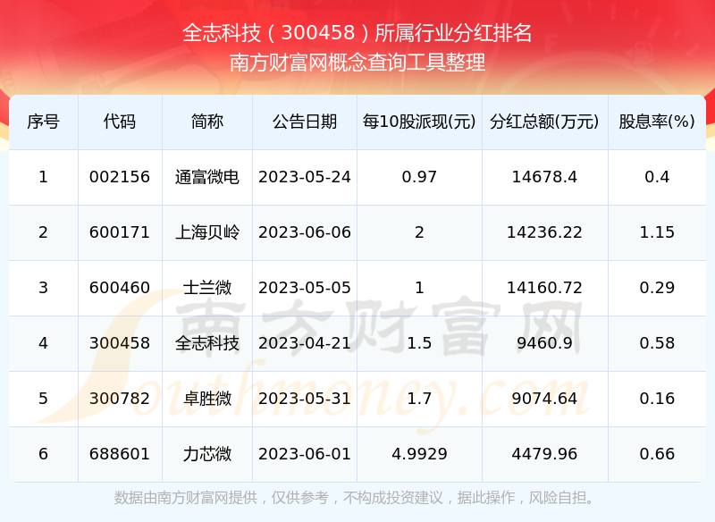 按照南方財富網(wǎng)趨勢選股系統(tǒng)統(tǒng)計,全志科技所屬行業(yè)為半導(dǎo)體行業(yè),半導(dǎo)體行業(yè)分紅排名情況如下表: