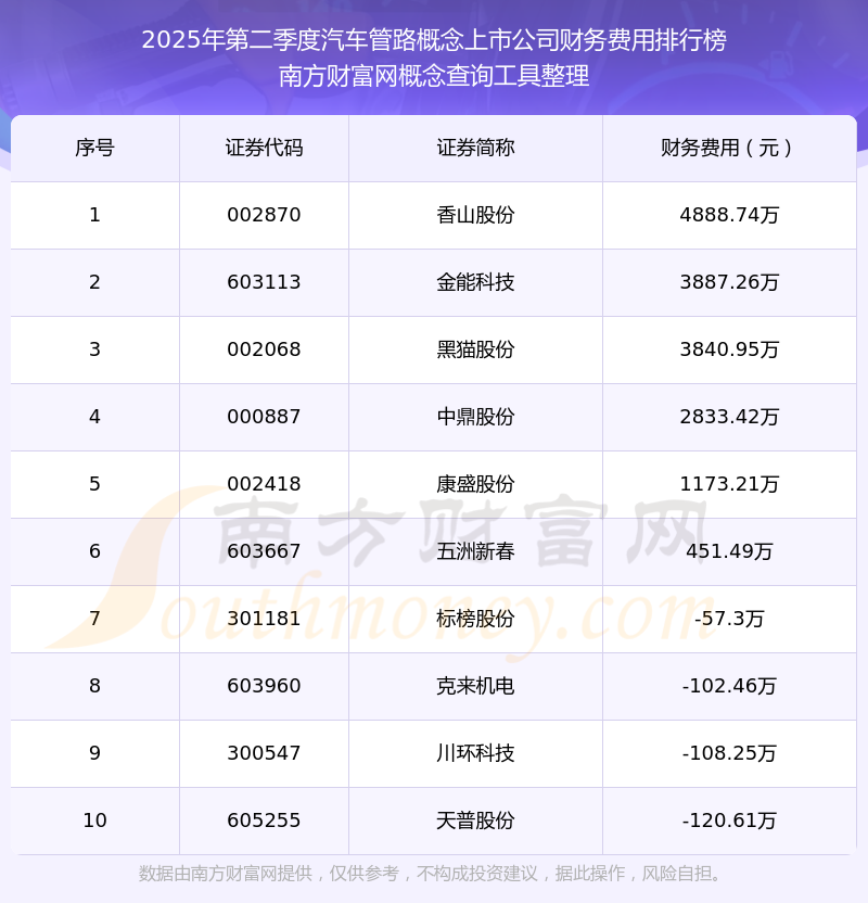 2025年第二季度汽車管路概念上市公司財務(wù)費用排行榜如下:香山股份(002870)的財務(wù)費用總額高達(dá)4888.74萬,金能科技(603113)和黑貓股份(002068)分別位居第二和第三,中鼎股份(000887)、康盛股份(002418)、五洲新春(603667)、標(biāo)榜股份(301181)、克來機電(603960)、川環(huán)科技(300547)、天普股份(605255)分別進入前十,其財務(wù)費用總額分別排名第4-10名。