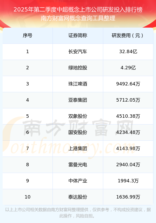 2025年第二季度,中超概念上市公司研發(fā)投入排名如下:長安汽車(000625)研發(fā)投入總額高達(dá)32.84億,綠地控股(600606)和珠江啤酒(002461)分別位居第二和第三,亞泰集團(tuán)(600881)、雙象股份(002395)、國安股份(000839)、上港集團(tuán)(600018)、雷曼光電(300162)、中體產(chǎn)業(yè)(600158)、泰達(dá)股份(000652)分別進(jìn)入前十,其研發(fā)投入總額分別排名第4-10名。