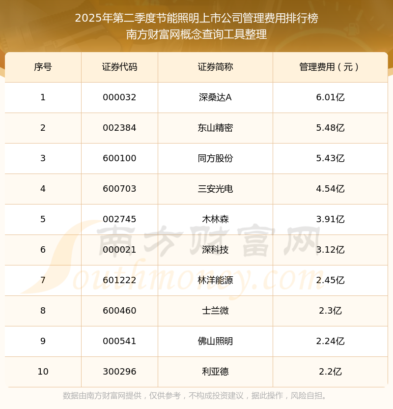 2025年第二季度,節(jié)能照明上市公司管理費(fèi)用排行榜中,深桑達(dá)A(000032)的管理費(fèi)用總額高達(dá)6.01億,東山精密(002384)和同方股份(600100)分別位居第二和第三,三安光電(600703)、木林森(002745)、深科技(000021)、林洋能源(601222)、士蘭微(600460)、佛山照明(000541)、利亞德(300296)分別進(jìn)入前十,其管理費(fèi)用總額分別排名第4-10名。