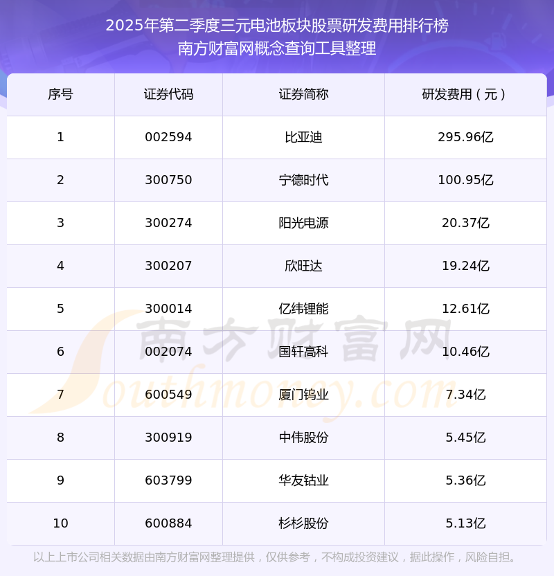 2025年第二季度,三元電池板塊股票研發(fā)費用排行榜中,比亞迪(002594)研發(fā)費用總額高達295.96億,寧德時代(300750)和陽光電源(300274)位居第二和第三,欣旺達(300207)、億緯鋰能(300014)、國軒高科(002074)、廈門鎢業(yè)(600549)、中偉股份(300919)、華友鈷業(yè)(603799)、杉杉股份(600884)進入前十,研發(fā)費用總額分別排名第4-10名。