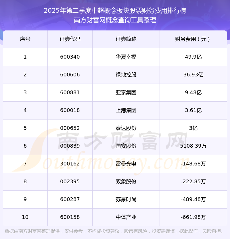 2025年第二季度中超概念板塊股票財務(wù)費(fèi)用排行榜如下:華夏幸福(600340)的財務(wù)費(fèi)用總額高達(dá)49.9億,綠地控股(600606)和亞泰集團(tuán)(600881)分別排名第二和第三,上港集團(tuán)(600018)、泰達(dá)股份(000652)、國安股份(000839)、雷曼光電(300162)、雙象股份(002395)、蘇豪時尚(600287)、中體產(chǎn)業(yè)(600158)分別進(jìn)入前十,其財務(wù)費(fèi)用總額分別排名第4-10名。