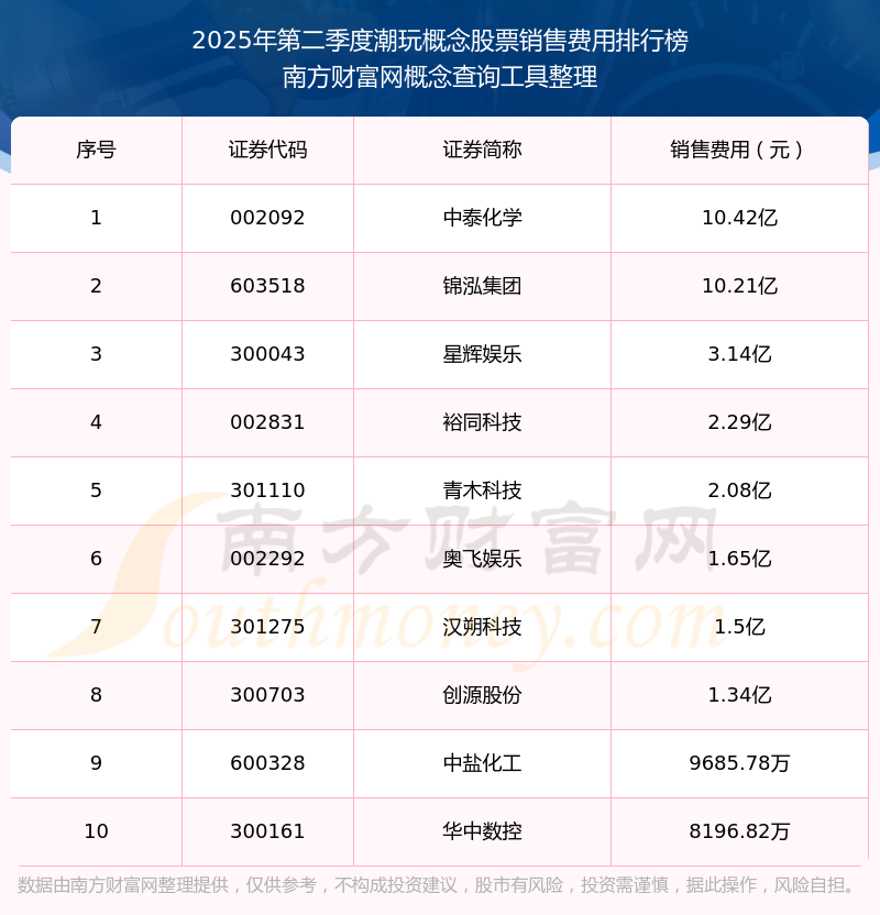 2025年第二季度,潮玩概念股票銷售費(fèi)用排名中,中泰化學(xué)(002092)銷售費(fèi)用總額高達(dá)10.42億,錦泓集團(tuán)(603518)和星輝娛樂(300043)排名第二和第三,裕同科技(002831)、青木科技(301110)、奧飛娛樂(002292)、漢朔科技(301275)、創(chuàng)源股份(300703)、中鹽化工(600328)、華中數(shù)控(300161)進(jìn)入前十,銷售費(fèi)用總額分別排名第4-10名。