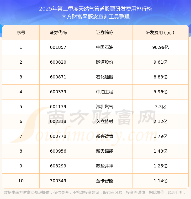 2025年第二季度天然氣管道股票研發(fā)費用排行榜如下:中國石油(601857)研發(fā)費用總額高達98.99億,隧道股份(600820)和石化油服(600871)分別位居第二和第三,中油工程(600339)、深圳燃氣(601139)、久立特材(002318)、新興鑄管(000778)、新天綠能(600956)、蘇鹽井神(603299)、金卡智能(300349)分別進入前十,其研發(fā)費用總額分別排名第4-10名。