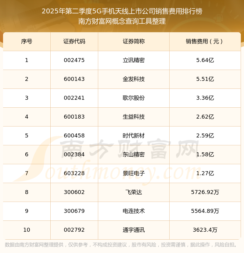 2025年第二季度,5G手機(jī)天線上市公司銷售費(fèi)用排行榜如下:立訊精密(002475)的銷售費(fèi)用總額高達(dá)5.64億,金發(fā)科技(600143)和歌爾股份(002241)分別排名第二和第三,生益科技(600183)、時(shí)代新材(600458)、東山精密(002384)、景旺電子(603228)、飛榮達(dá)(300602)、電連技術(shù)(300679)、通宇通訊(002792)分別進(jìn)入前十,其銷售費(fèi)用總額分別排名第4-10名。