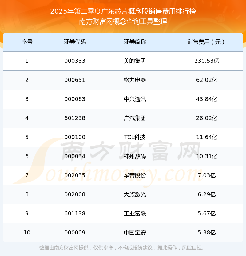 2025年第二季度,廣東芯片概念股銷售費(fèi)用排行榜如下:美的集團(tuán)(000333)的銷售費(fèi)用總額高達(dá)230.53億,格力電器(000651)和中興通訊(000063)分別位居第二和第三,廣汽集團(tuán)(601238)、TCL科技(000100)、神州數(shù)碼(000034)、華帝股份(002035)、大族激光(002008)、工業(yè)富聯(lián)(601138)、中國(guó)寶安(000009)分別進(jìn)入前十,其銷售費(fèi)用總額分別排名第4-10名。