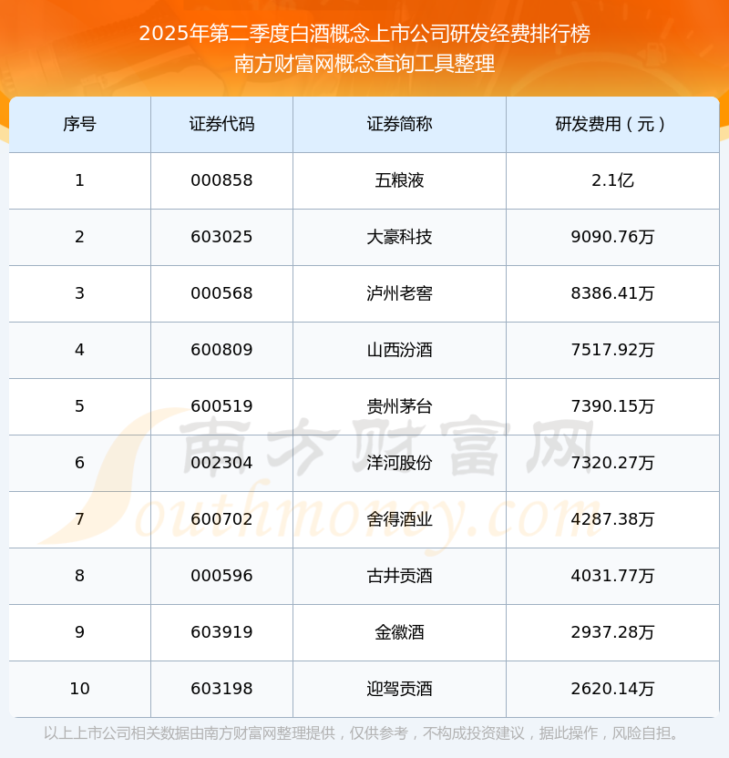 2025年第二季度白酒概念概念上市公司研發(fā)經(jīng)費排行榜如下:五糧液(000858)研發(fā)經(jīng)費總額高達(dá)2.1億,大豪科技(603025)和瀘州老窖(000568)分別位居第二和第三,山西汾酒(600809)、貴州茅臺(600519)、洋河股份(002304)、舍得酒業(yè)(600702)、古井貢酒(000596)、金徽酒(603919)、迎駕貢酒(603198)分別進(jìn)入前十,其研發(fā)經(jīng)費總額分別排名第4-10名。