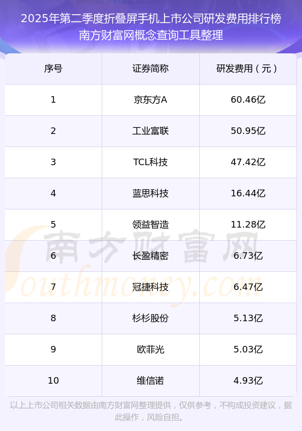 2025年第二季度,折疊屏手機上市公司研發(fā)費用排行榜中,京東方A(000725)研發(fā)費用總額高達(dá)60.46億,工業(yè)富聯(lián)(601138)和TCL科技(000100)位居第二和第三,藍(lán)思科技(300433)、領(lǐng)益智造(002600)、長盈精密(300115)、冠捷科技(000727)、杉杉股份(600884)、歐菲光(002456)、維信諾(002387)進(jìn)入前十,研發(fā)費用總額分別排名第4-10名。