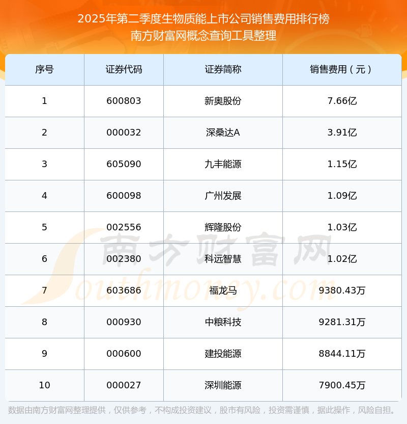 2025年第二季度,生物質(zhì)能上市公司銷售費(fèi)用排行榜如下:新奧股份(600803)的銷售費(fèi)用總額高達(dá)7.66億,深桑達(dá)A(000032)和九豐能源(605090)分別排名第二和第三,廣州發(fā)展(600098)、輝隆股份(002556)、科遠(yuǎn)智慧(002380)、福龍馬(603686)、中糧科技(000930)、建投能源(000600)、深圳能源(000027)分別進(jìn)入前十,其銷售費(fèi)用總額分別排名第4-10名。