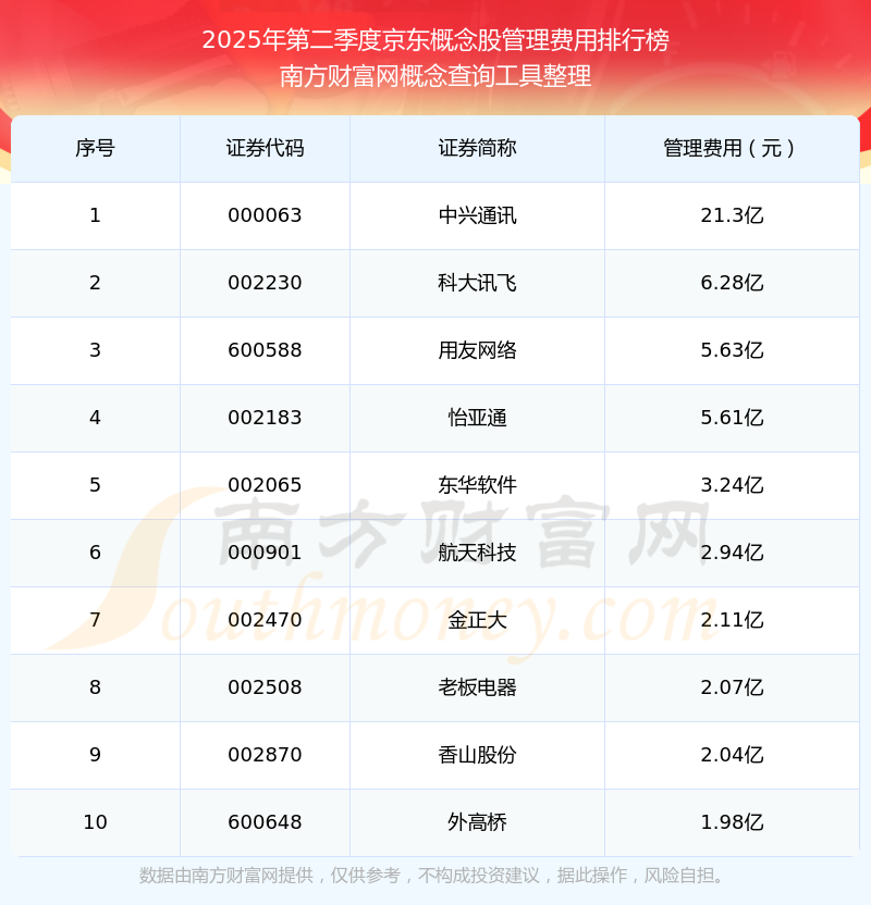 2025年第二季度,京東概念概念股管理費用排名中,中興通訊(000063)的管理費用總額高達21.3億,科大訊飛(002230)和用友網(wǎng)絡(luò)(600588)排名第二和第三,怡亞通(002183)、東華軟件(002065)、航天科技(000901)、金正大(002470)、老板電器(002508)、香山股份(002870)、外高橋(600648)進入前十,其管理費用總額分別排名第4-10名。