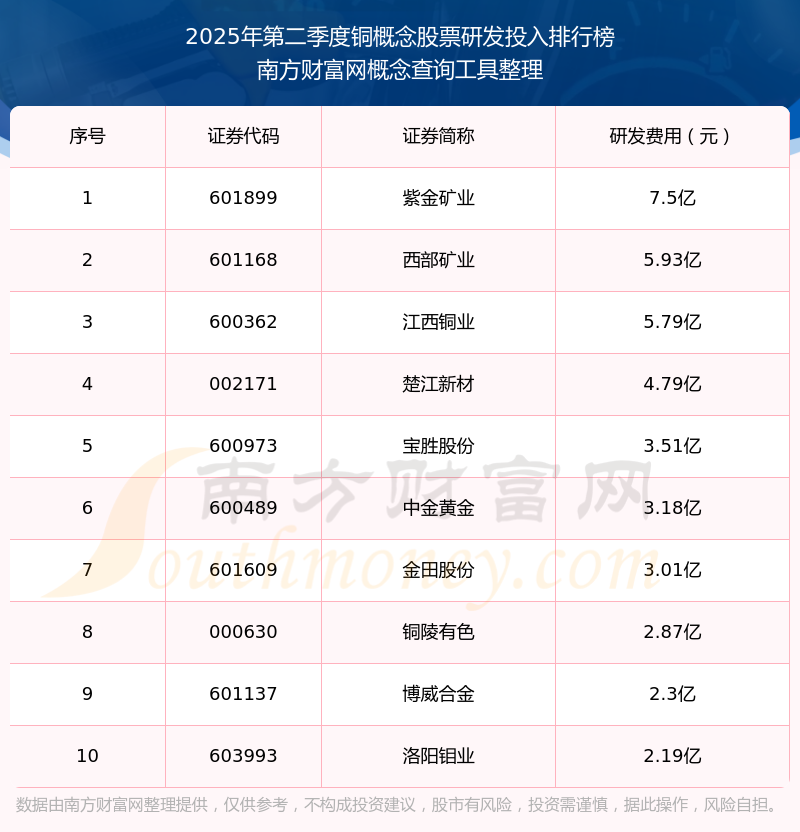 2025年第二季度銅概念股票研發(fā)投入排行榜如下:紫金礦業(yè)(601899)研發(fā)投入總額高達7.5億,西部礦業(yè)(601168)和江西銅業(yè)(600362)分別位居第二和第三,楚江新材(002171)、寶勝股份(600973)、中金黃金(600489)、金田股份(601609)、銅陵有色(000630)、博威合金(601137)、洛陽鉬業(yè)(603993)分別進入前十,其研發(fā)投入總額分別排名第4-10名。