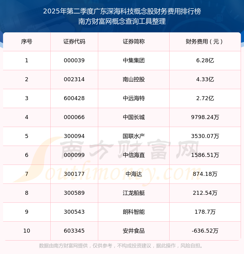 2025年第二季度,廣東深海科技概念股財(cái)務(wù)費(fèi)用排行榜中,中集集團(tuán)(000039)財(cái)務(wù)費(fèi)用總額高達(dá)6.28億,南山控股(002314)和中遠(yuǎn)海特(600428)位居第二和第三,中國長城(000066)、國聯(lián)水產(chǎn)(300094)、中信海直(000099)、中海達(dá)(300177)、江龍船艇(300589)、朗科智能(300543)、安井食品(603345)進(jìn)入前十,財(cái)務(wù)費(fèi)用總額分別排名第4-10名。