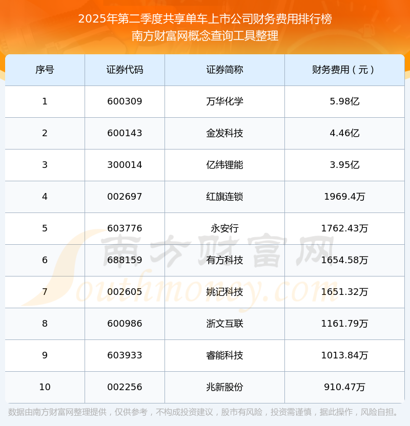 2025年第二季度共享單車上市公司財(cái)務(wù)費(fèi)用排行榜如下:萬華化學(xué)(600309)的財(cái)務(wù)費(fèi)用總額高達(dá)5.98億,金發(fā)科技(600143)和億緯鋰能(300014)分別排名第二和第三,紅旗連鎖(002697)、永安行(603776)、有方科技(688159)、姚記科技(002605)、浙文互聯(lián)(600986)、睿能科技(603933)、兆新股份(002256)分別進(jìn)入前十,其財(cái)務(wù)費(fèi)用總額分別排名第4-10名。