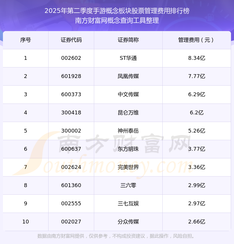 2025年第二季度,手游概念板塊股票管理費(fèi)用排行榜中,ST華通(002602)的管理費(fèi)用總額高達(dá)8.34億,鳳凰傳媒(601928)和中文傳媒(600373)分別位居第二和第三,昆侖萬維(300418)、神州泰岳(300002)、東方明珠(600637)、完美世界(002624)、三六零(601360)、三七互娛(002555)、分眾傳媒(002027)分別進(jìn)入前十,其管理費(fèi)用總額分別排名第4-10名。