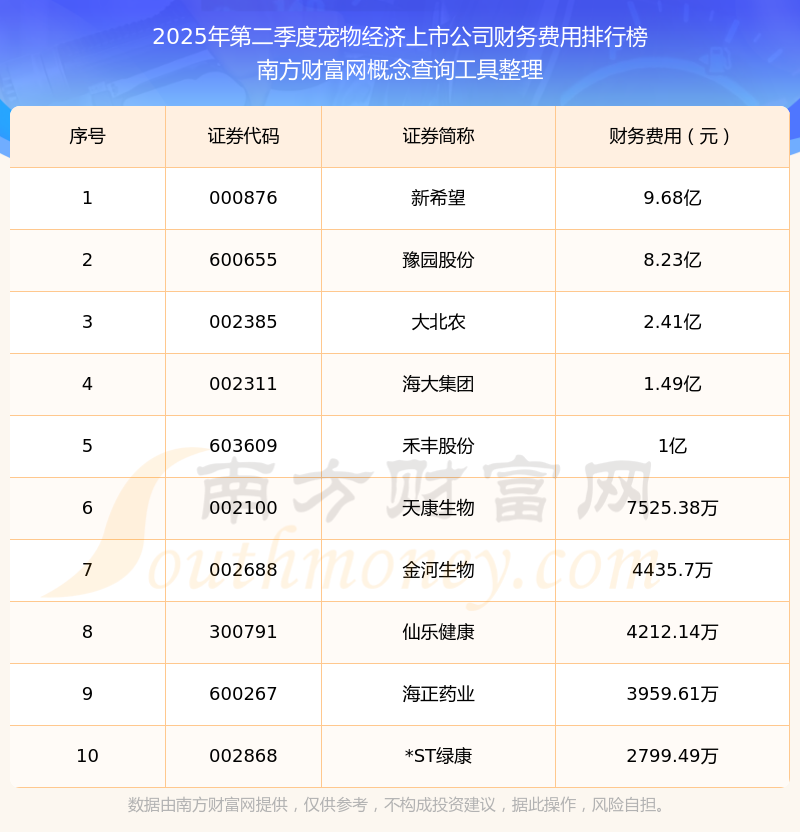 2025年第二季度,寵物經(jīng)濟(jì)上市公司財務(wù)費(fèi)用排行榜中,新希望(000876)財務(wù)費(fèi)用總額高達(dá)9.68億,豫園股份(600655)和大北農(nóng)(002385)排名第二和第三,海大集團(tuán)(002311)、禾豐股份(603609)、天康生物(002100)、金河生物(002688)、仙樂健康(300791)、海正藥業(yè)(600267)、*ST綠康(002868)進(jìn)入前十,財務(wù)費(fèi)用總額分別排名第4-10名。