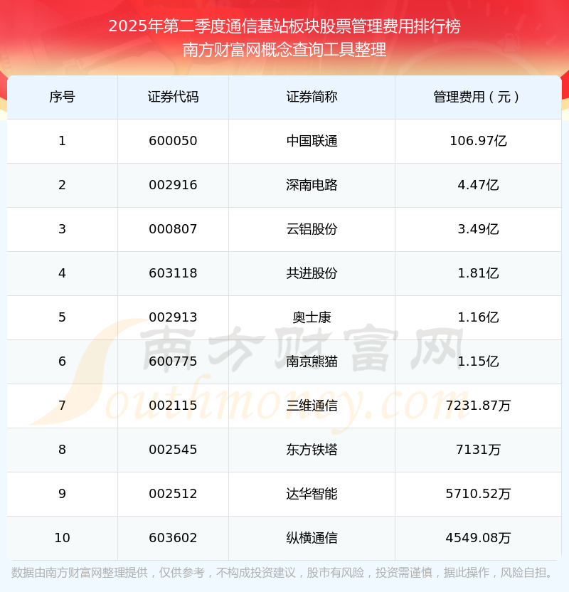2025年第二季度,通信基站板塊股票管理費(fèi)用排名中,中國聯(lián)通(600050)的管理費(fèi)用總額高達(dá)106.97億,深南電路(002916)和云鋁股份(000807)排名第二和第三,共進(jìn)股份(603118)、奧士康(002913)、南京熊貓(600775)、三維通信(002115)、東方鐵塔(002545)、達(dá)華智能(002512)、縱橫通信(603602)進(jìn)入前十,其管理費(fèi)用總額分別排名第4-10名。
