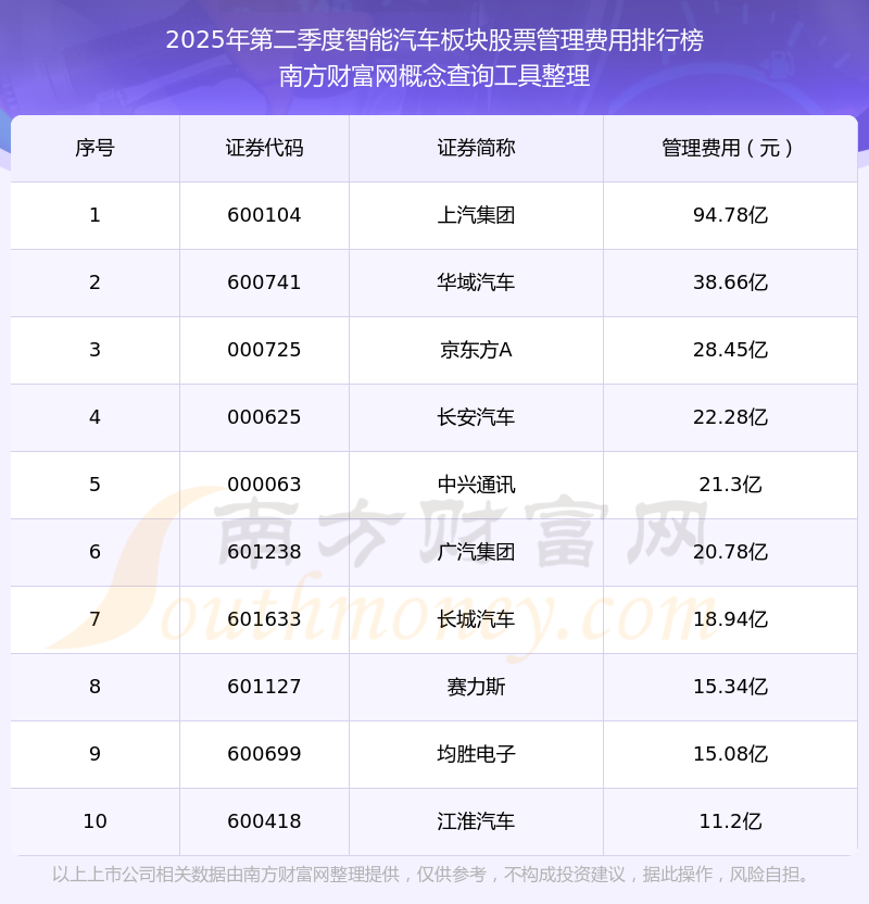 2025年第二季度,智能汽車板塊股票管理費(fèi)用排行榜中,上汽集團(tuán)(600104)的管理費(fèi)用總額高達(dá)94.78億,華域汽車(600741)和京東方A(000725)分別位居第二和第三,長(zhǎng)安汽車(000625)、中興通訊(000063)、廣汽集團(tuán)(601238)、長(zhǎng)城汽車(601633)、賽力斯(601127)、均勝電子(600699)、江淮汽車(600418)分別進(jìn)入前十,其管理費(fèi)用總額分別排名第4-10名。