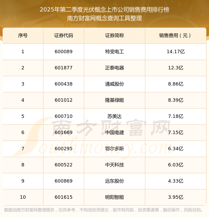 2025年第二季度,光伏概念上市公司銷售費用排行榜如下:特變電工(600089)的銷售費用總額高達(dá)14.17億,正泰電器(601877)和通威股份(600438)分別位居第二和第三,隆基綠能(601012)、蘇美達(dá)(600710)、中國電建(601669)、鄂爾多斯(600295)、中天科技(600522)、遠(yuǎn)東股份(600869)、明陽智能(601615)分別進入前十,其銷售費用總額分別排名第4-10名。