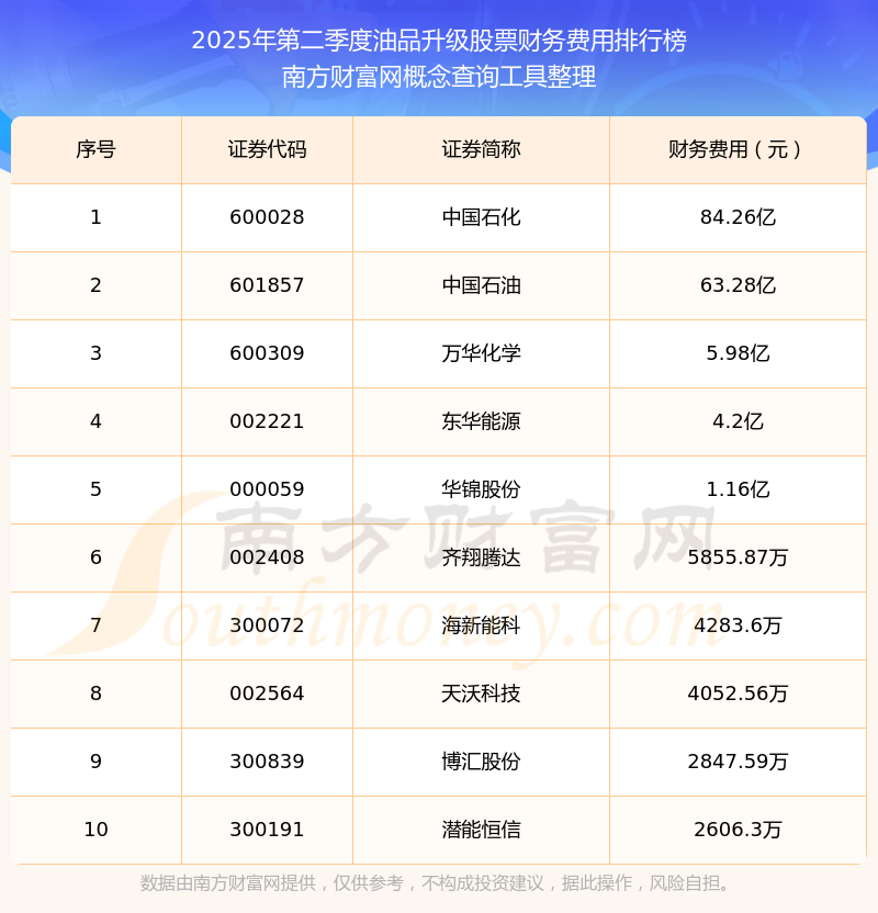 2025年第二季度油品升級股票財務(wù)費用排行榜如下:中國石化(600028)的財務(wù)費用總額高達84.26億,中國石油(601857)和萬華化學(xué)(600309)分別排名第二和第三,東華能源(002221)、華錦股份(000059)、齊翔騰達(002408)、海新能科(300072)、天沃科技(002564)、博匯股份(300839)、潛能恒信(300191)分別進入前十,其財務(wù)費用總額分別排名第4-10名。