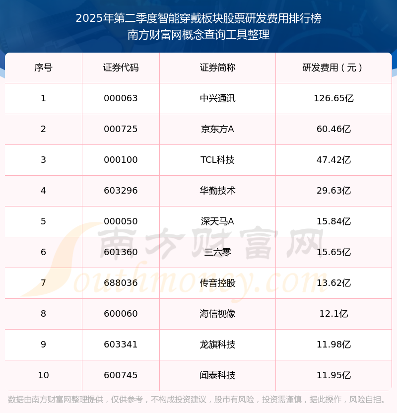 2025年第二季度智能穿戴板塊股票研發(fā)費(fèi)用排行榜如下:中興通訊(000063)研發(fā)費(fèi)用總額高達(dá)126.65億,京東方A(000725)和TCL科技(000100)分別排名第二和第三,華勤技術(shù)(603296)、深天馬A(000050)、三六零(601360)、傳音控股(688036)、海信視像(600060)、龍旗科技(603341)、聞泰科技(600745)分別進(jìn)入前十,其研發(fā)費(fèi)用總額分別排名第4-10名。