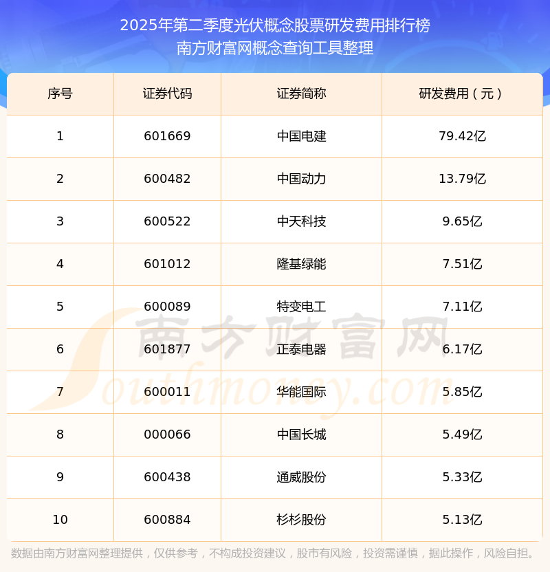 2025年第二季度光伏概念股票研發(fā)費用排行榜如下:中國電建(601669)研發(fā)費用總額高達(dá)79.42億,中國動力(600482)和中天科技(600522)分別位居第二和第三,隆基綠能(601012)、特變電工(600089)、正泰電器(601877)、華能國際(600011)、中國長城(000066)、通威股份(600438)、杉杉股份(600884)分別進(jìn)入前十,其研發(fā)費用總額分別排名第4-10名。