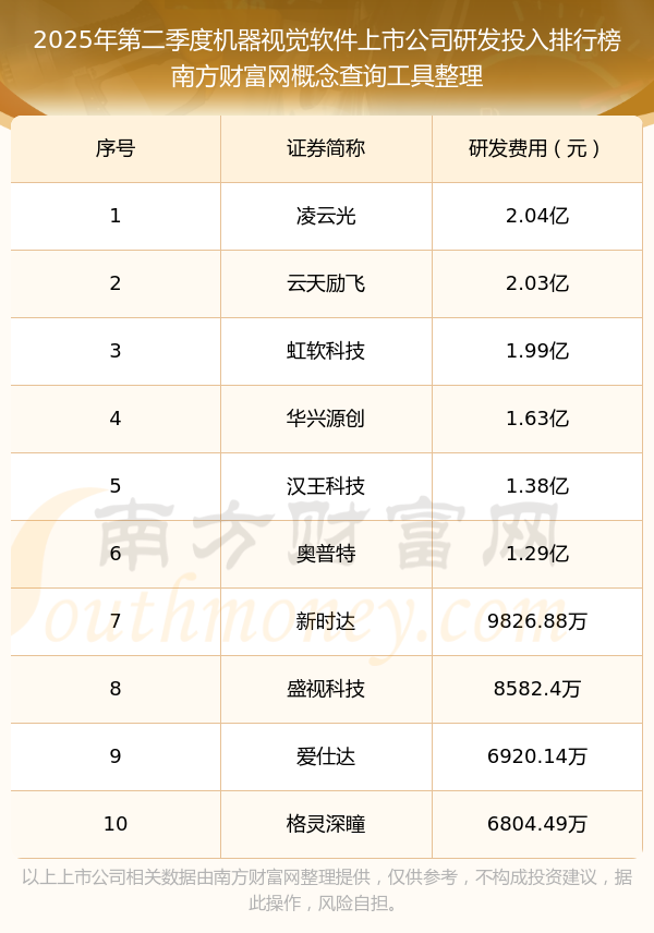2025年第二季度,機器視覺軟件上市公司研發(fā)投入排名如下:凌云光(688400)研發(fā)投入總額高達(dá)2.04億,云天勵飛(688343)和虹軟科技(688088)分別位居第二和第三,華興源創(chuàng)(688001)、漢王科技(002362)、奧普特(688686)、新時達(dá)(002527)、盛視科技(002990)、愛仕達(dá)(002403)、格靈深瞳(688207)分別進(jìn)入前十,其研發(fā)投入總額分別排名第4-10名。
