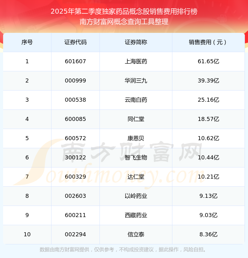 2025年第二季度,獨(dú)家藥品概念股銷(xiāo)售費(fèi)用排名中,上海醫(yī)藥(601607)銷(xiāo)售費(fèi)用總額高達(dá)61.65億,華潤(rùn)三九(000999)和云南白藥(000538)排名第二和第三,同仁堂(600085)、康恩貝(600572)、智飛生物(300122)、達(dá)仁堂(600329)、以嶺藥業(yè)(002603)、西藏藥業(yè)(600211)、信立泰(002294)進(jìn)入前十,銷(xiāo)售費(fèi)用總額分別排名第4-10名。