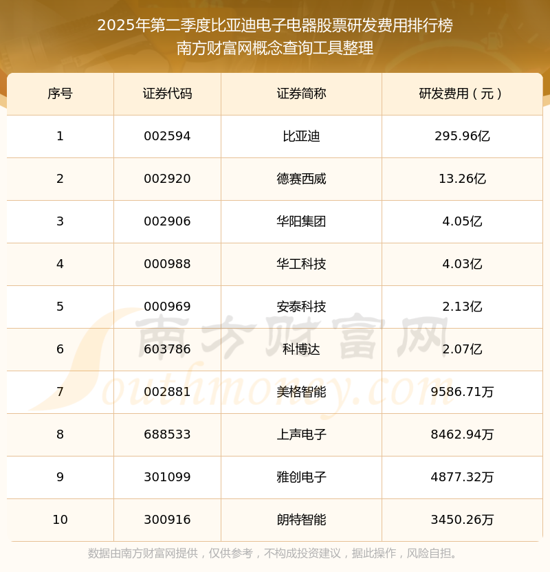 2025年第二季度,比亞迪電子電器股票研發(fā)費(fèi)用排行榜中,比亞迪(002594)研發(fā)費(fèi)用總額高達(dá)295.96億,德賽西威(002920)和華陽集團(tuán)(002906)位居第二和第三,華工科技(000988)、安泰科技(000969)、科博達(dá)(603786)、美格智能(002881)、上聲電子(688533)、雅創(chuàng)電子(301099)、朗特智能(300916)進(jìn)入前十,研發(fā)費(fèi)用總額分別排名第4-10名。