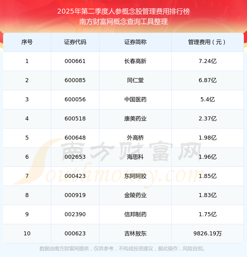 2025年第二季度,人參概念股管理費(fèi)用排行榜中,長春高新(000661)的管理費(fèi)用總額高達(dá)7.24億,同仁堂(600085)和中國醫(yī)藥(600056)分別位居第二和第三,康美藥業(yè)(600518)、外高橋(600648)、海思科(002653)、東阿阿膠(000423)、金陵藥業(yè)(000919)、信邦制藥(002390)、吉林敖東(000623)分別進(jìn)入前十,其管理費(fèi)用總額分別排名第4-10名。