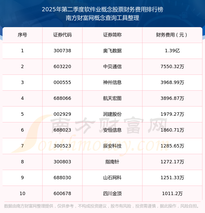 2025年第二季度軟件業(yè)概念股票財(cái)務(wù)費(fèi)用排行榜如下:奧飛數(shù)據(jù)(300738)的財(cái)務(wù)費(fèi)用總額高達(dá)1.39億,中貝通信(603220)和神州信息(000555)分別位居第二和第三,航天宏圖(688066)、潤(rùn)建股份(002929)、安恒信息(688023)、辰安科技(300523)、指南針(300803)、山石網(wǎng)科(688030)、四川金頂(600678)分別進(jìn)入前十,其財(cái)務(wù)費(fèi)用總額分別排名第4-10名。