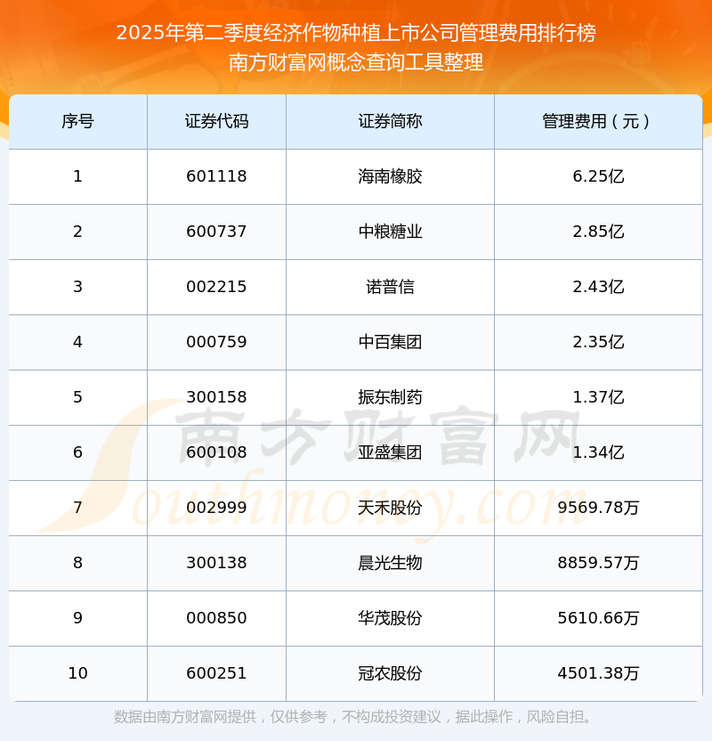 2025年第二季度,經(jīng)濟(jì)作物種植上市公司管理費(fèi)用排名中,海南橡膠(601118)的管理費(fèi)用總額高達(dá)6.25億,中糧糖業(yè)(600737)和諾普信(002215)排名第二和第三,中百集團(tuán)(000759)、振東制藥(300158)、亞盛集團(tuán)(600108)、天禾股份(002999)、晨光生物(300138)、華茂股份(000850)、冠農(nóng)股份(600251)進(jìn)入前十,其管理費(fèi)用總額分別排名第4-10名。