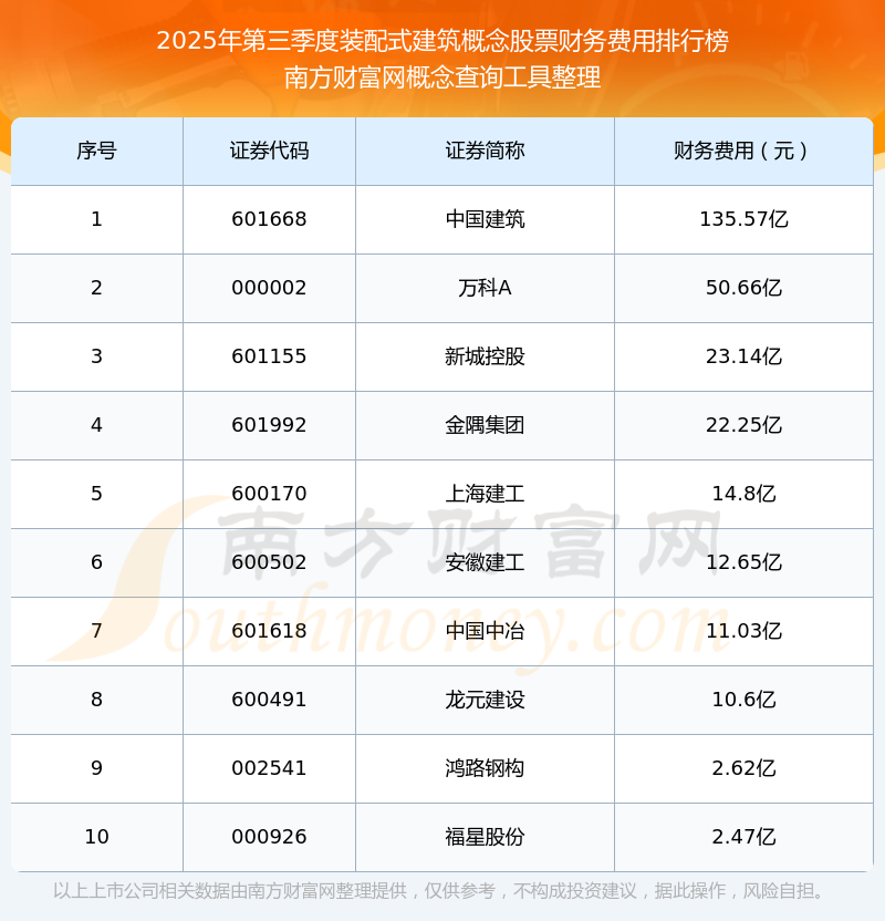 2025年第三季度裝配式建筑概念股票財務(wù)費用排行榜如下:中國建筑(601668)的財務(wù)費用總額高達135.57億,萬科A(000002)和新城控股(601155)分別排名第二和第三,金隅集團(601992)、上海建工(600170)、安徽建工(600502)、中國中冶(601618)、龍元建設(shè)(600491)、鴻路鋼構(gòu)(002541)、福星股份(000926)分別進入前十,其財務(wù)費用總額分別排名第4-10名。