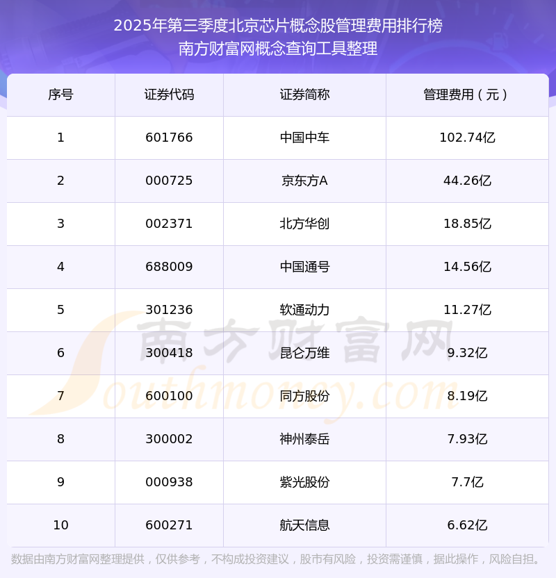 2025年第三季度,北京芯片概念股管理費(fèi)用排行榜如下:中國(guó)中車(chē)(601766)的管理費(fèi)用總額高達(dá)102.74億,京東方A(000725)和北方華創(chuàng)(002371)分別排名第二和第三,中國(guó)通號(hào)(688009)、軟通動(dòng)力(301236)、昆侖萬(wàn)維(300418)、同方股份(600100)、神州泰岳(300002)、紫光股份(000938)、航天信息(600271)分別進(jìn)入前十,其管理費(fèi)用總額分別排名第4-10名。