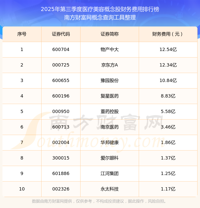 2025年第三季度醫(yī)療美容概念股財務(wù)費(fèi)用排行榜如下:物產(chǎn)中大(600704)的財務(wù)費(fèi)用總額高達(dá)12.54億,京東方A(000725)和豫園股份(600655)分別位居第二和第三,復(fù)星醫(yī)藥(600196)、重藥控股(000950)、南京醫(yī)藥(600713)、華邦健康(002004)、愛爾眼科(300015)、江河集團(tuán)(601886)、永太科技(002326)分別進(jìn)入前十,其財務(wù)費(fèi)用總額分別排名第4-10名。