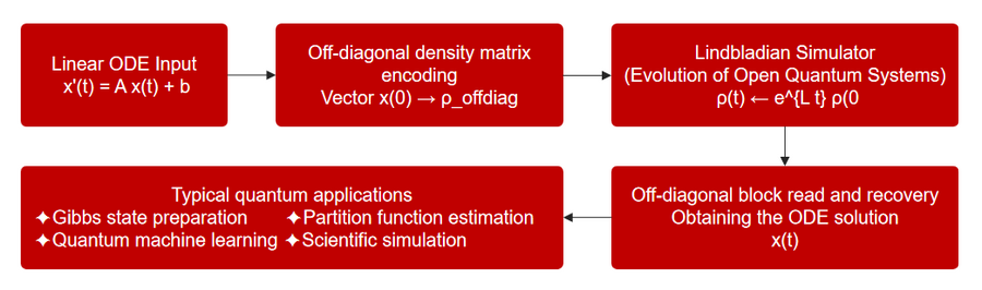 此項(xiàng)新技術(shù)的核心思想始于開放量子系統(tǒng)理論。開放量子系統(tǒng)用于描述量子態(tài)與環(huán)境之間的相互作用,其演化不再滿足標(biāo)準(zhǔn)薛定諤方程,而服從Lindblad 主方程。Lindblad 方程中的動(dòng)力學(xué)不僅包含酉部分,還包含耗散項(xiàng),因此可以自然呈現(xiàn)出膨脹、衰減、態(tài)混合、退相干等非酉行為。微算法科技團(tuán)隊(duì)注意到,正是這些非酉性質(zhì),與求解一般線性 ODE 中的線性算符作用有著潛在映射關(guān)系。如果能將 ODE 的系數(shù)矩陣編碼成 Lindbladian 的生成元,那么 ODE 的演化過程就可以作為密度矩陣非對(duì)角塊上的演化來捕獲;谶@一觀察,微算法科技提出了非對(duì)角密度矩陣編碼,將向量式 ODE x‘(t)(t)=Ax(t)+b 轉(zhuǎn)化為一個(gè)在密度矩陣特定子空間上作用的 Lindbladian 動(dòng)力學(xué)問題。