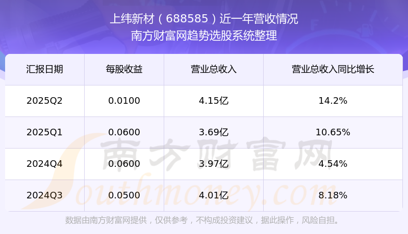 上緯新材(688585)披露2025年第二季度報(bào)告,報(bào)告期實(shí)現(xiàn)營收4.15億元,同比14.2%;歸母凈利潤734.98萬元,同比-71.87%;扣非凈利潤479.53萬元,同比-80.36%;基本每股收益0.01元。