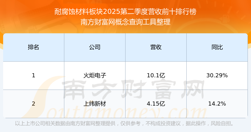 按照南方財(cái)富網(wǎng)概念查詢工具統(tǒng)計(jì),該股所屬板塊為耐腐蝕材料板塊,該板塊共有2只股票,上緯新材2025第二季度營收在該板塊中排名為第2名,該板塊2025第二季度營收排名前十的股票如下表: