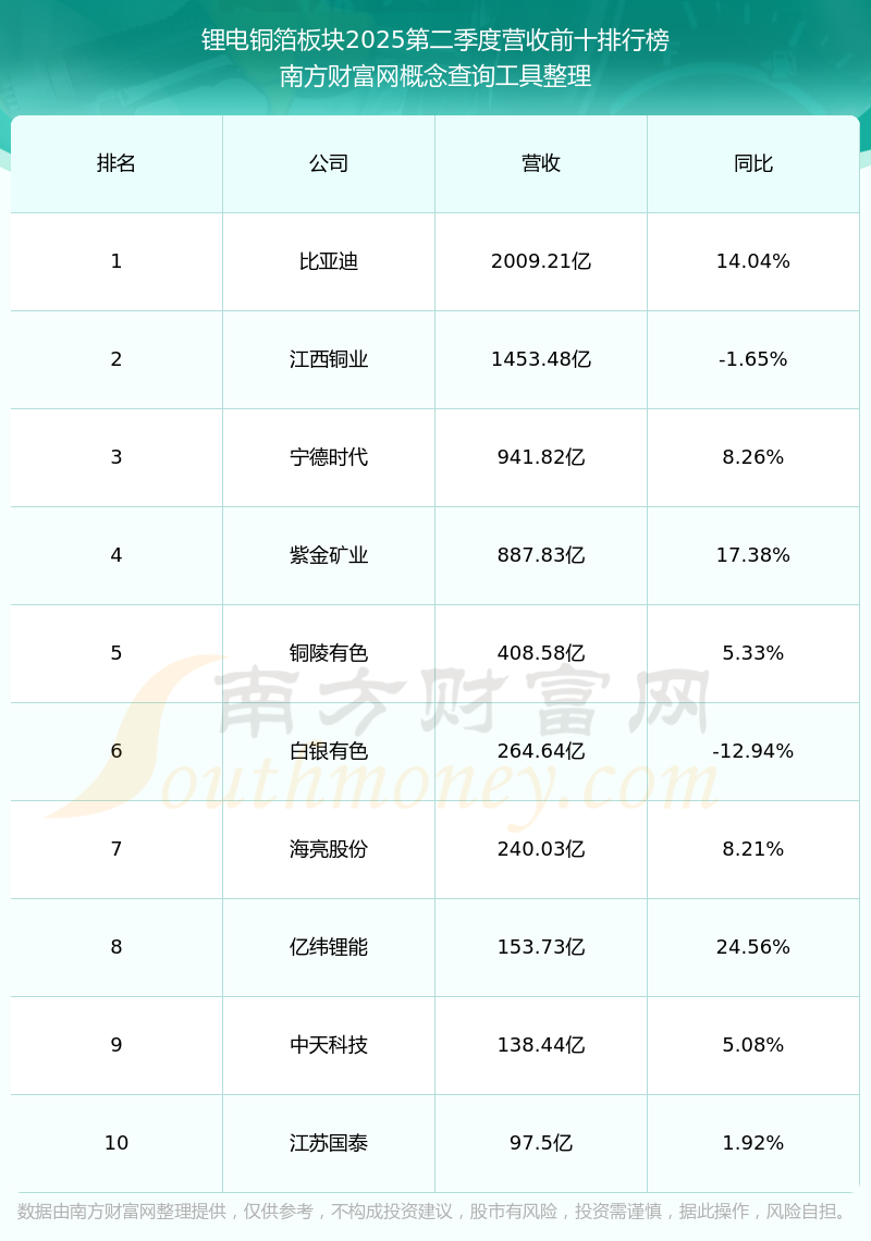 按照南方財富網(wǎng)概念查詢工具統(tǒng)計,該股所屬板塊為鋰電銅箔板塊,該板塊共有36只股票,嘉元科技2025第二季度營收在該板塊中排名為第18名,該板塊2025第二季度營收排名前十的股票如下表:
