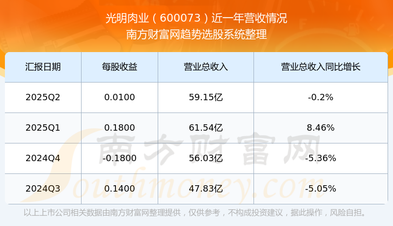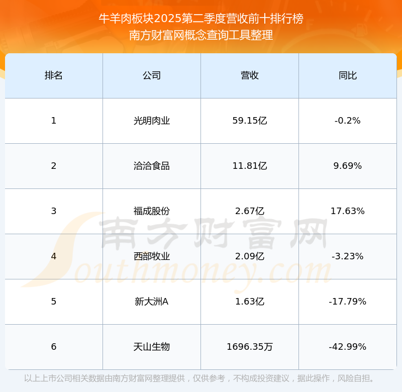 按照南方財(cái)富網(wǎng)概念查詢工具統(tǒng)計(jì),該股所屬板塊為牛羊肉板塊,該板塊共有6只股票,光明肉業(yè)2025第二季度營收在該板塊中排名為第1名,該板塊2025第二季度營收排名前十的股票如下表: