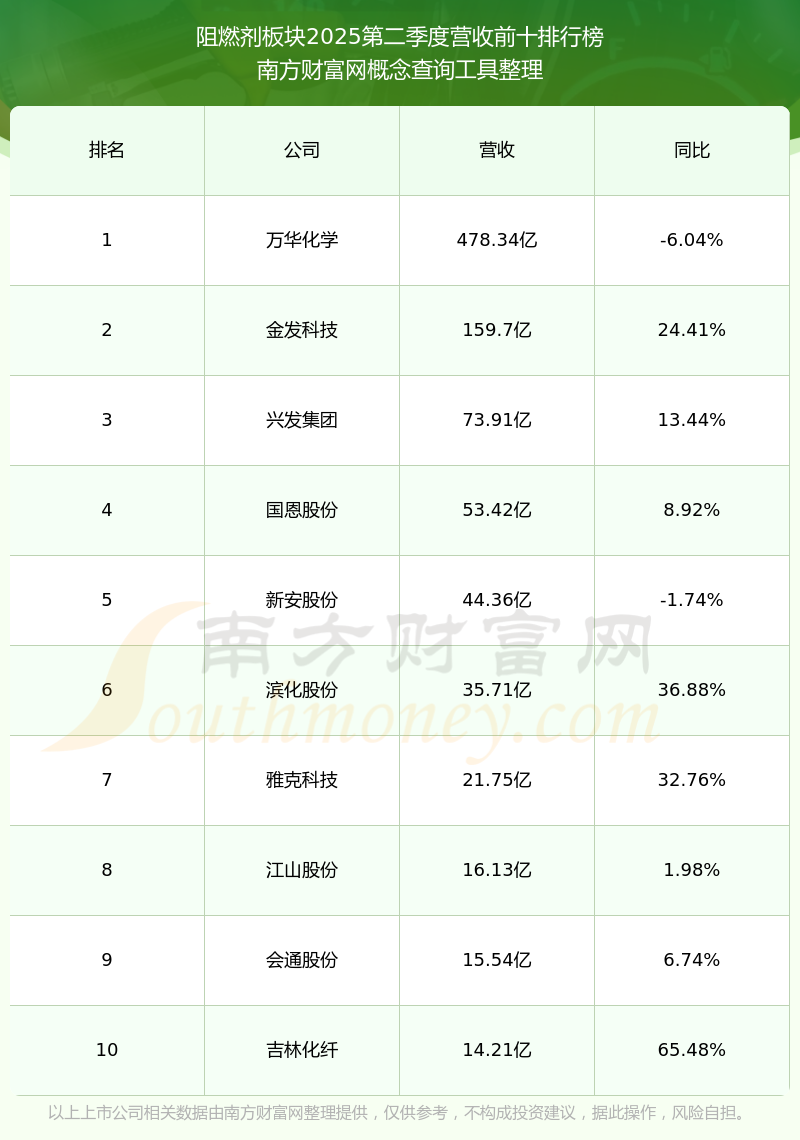 按照南方財(cái)富網(wǎng)概念查詢工具統(tǒng)計(jì),該股所屬板塊為阻燃劑板塊,該板塊共有24只股票,萬(wàn)盛股份2025第二季度營(yíng)收在該板塊中排名為第17名,該板塊2025第二季度營(yíng)收排名前十的股票如下表: