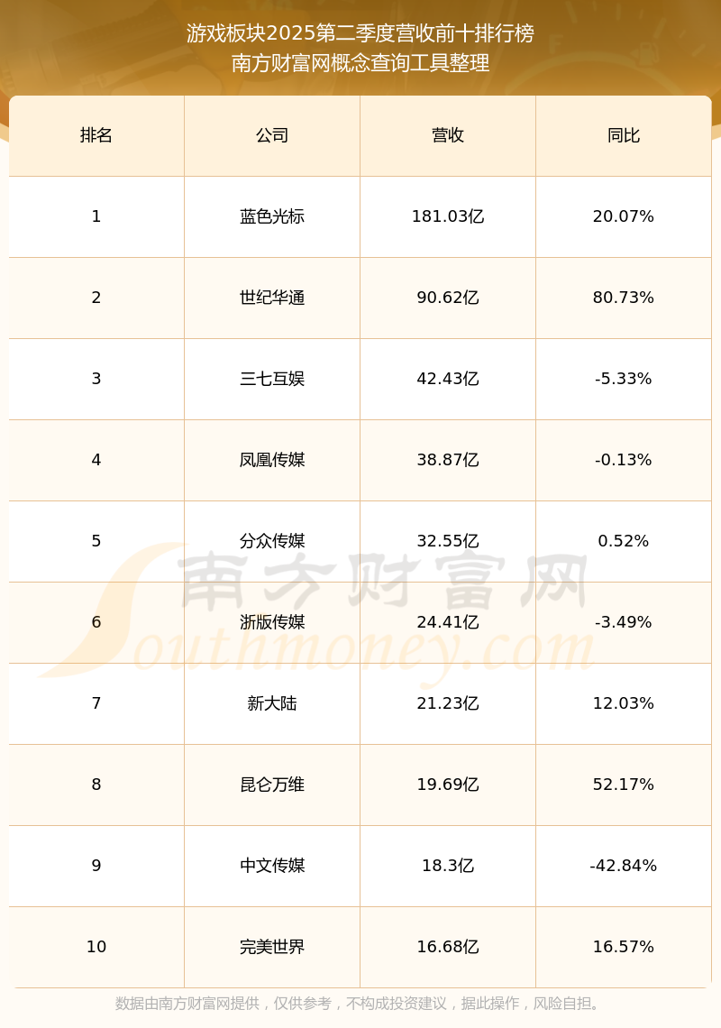 按照南方財(cái)富網(wǎng)概念查詢(xún)工具統(tǒng)計(jì),該股所屬板塊為游戲板塊,該板塊共有84只股票,浙數(shù)文化2025第二季度營(yíng)收在該板塊中排名為第23名,該板塊2025第二季度營(yíng)收排名前十的股票如下表: