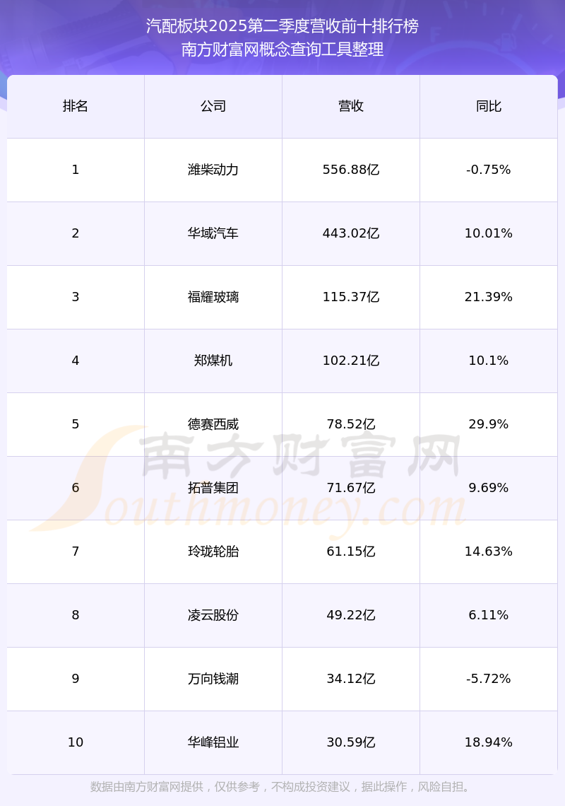 按照南方財(cái)富網(wǎng)概念查詢工具統(tǒng)計(jì),該股所屬板塊為汽配板塊,該板塊共有103只股票,浙江龍盛2025第二季度營收在該板塊中排名為第103名,該板塊2025第二季度營收排名前十的股票如下表: