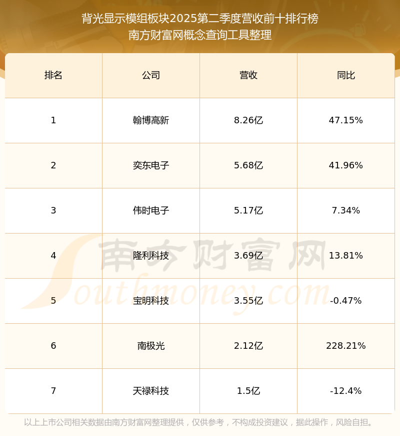 按照南方財富網(wǎng)概念查詢工具統(tǒng)計,該股所屬板塊為背光顯示模組板塊,該板塊共有7只股票,偉時電子2025第二季度營收在該板塊中排名為第3名,該板塊2025第二季度營收排名前十的股票如下表: