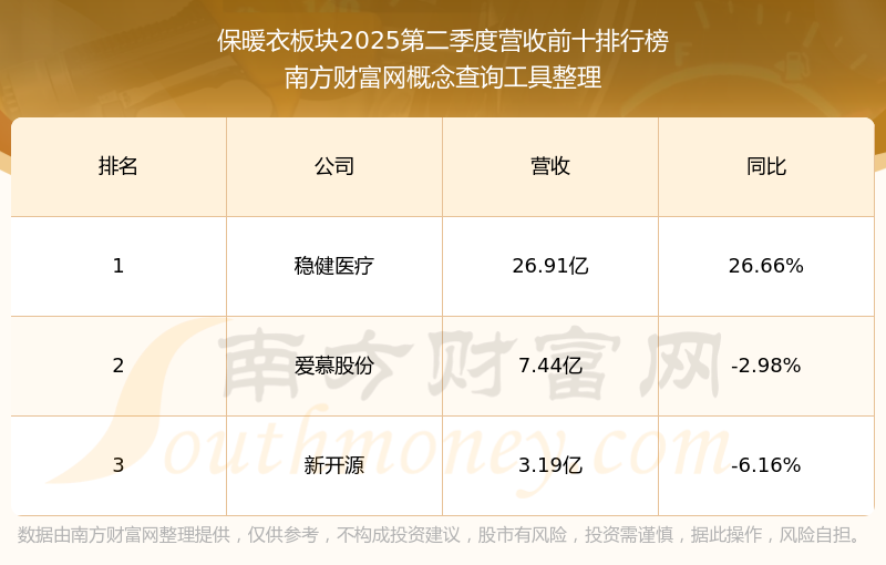 按照南方財富網(wǎng)概念查詢工具統(tǒng)計,該股所屬板塊為保暖衣板塊,該板塊共有3只股票,愛慕股份2025第二季度營收在該板塊中排名為第2名,該板塊2025第二季度營收排名前十的股票如下表: