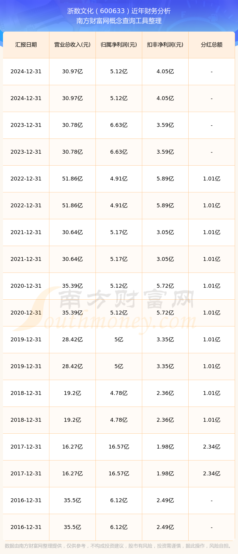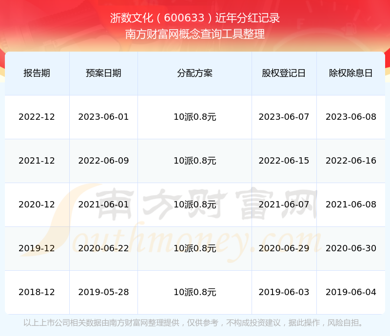 浙數(shù)文化歷年分紅派息情況如下表所示: