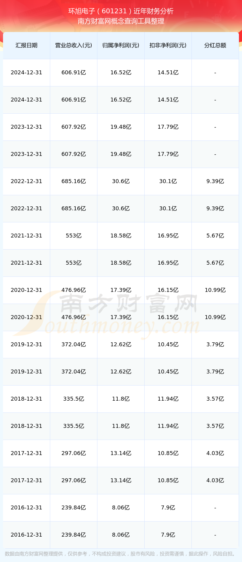 近年環(huán)旭電子分紅派息情況如下表所示: